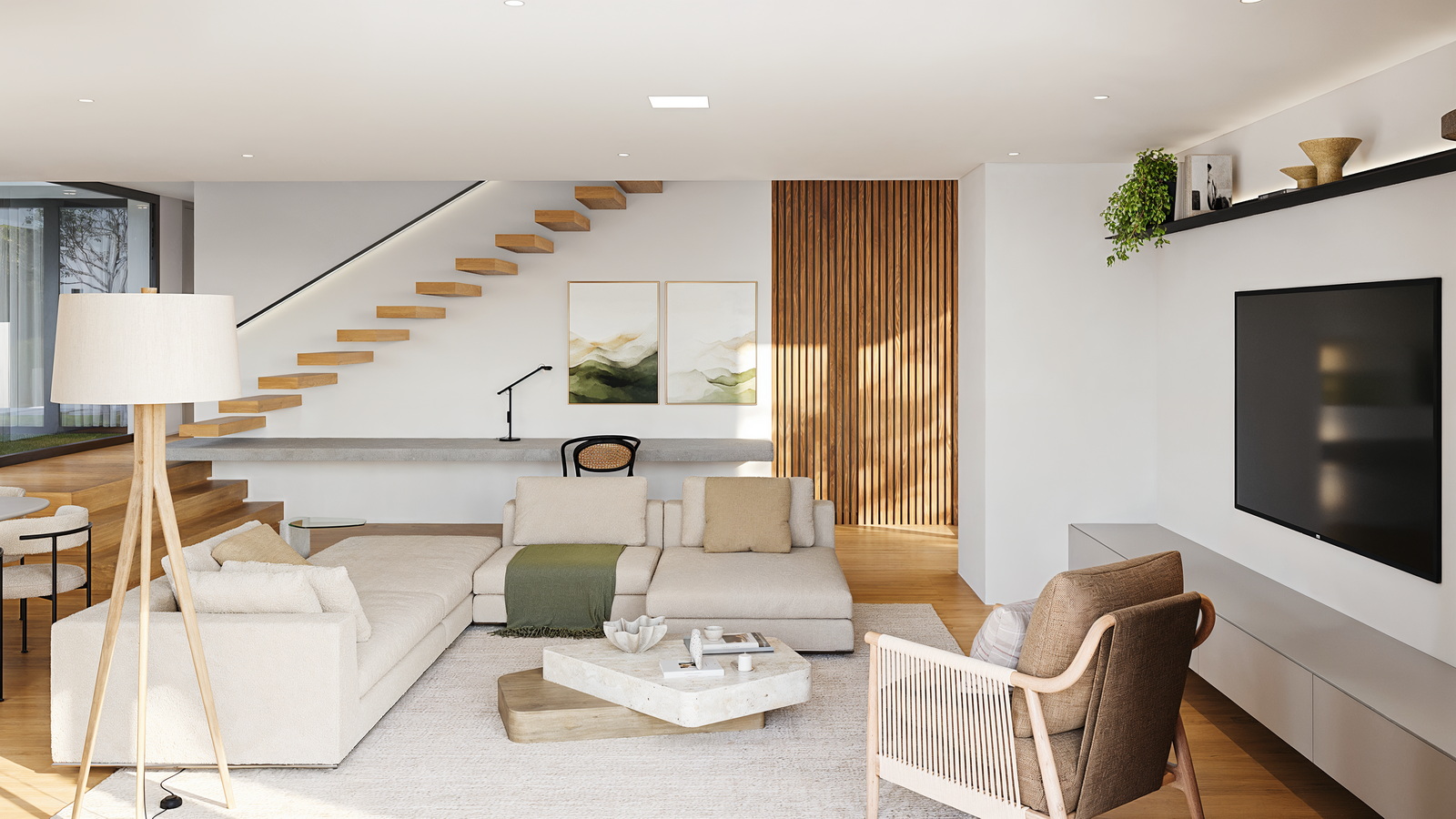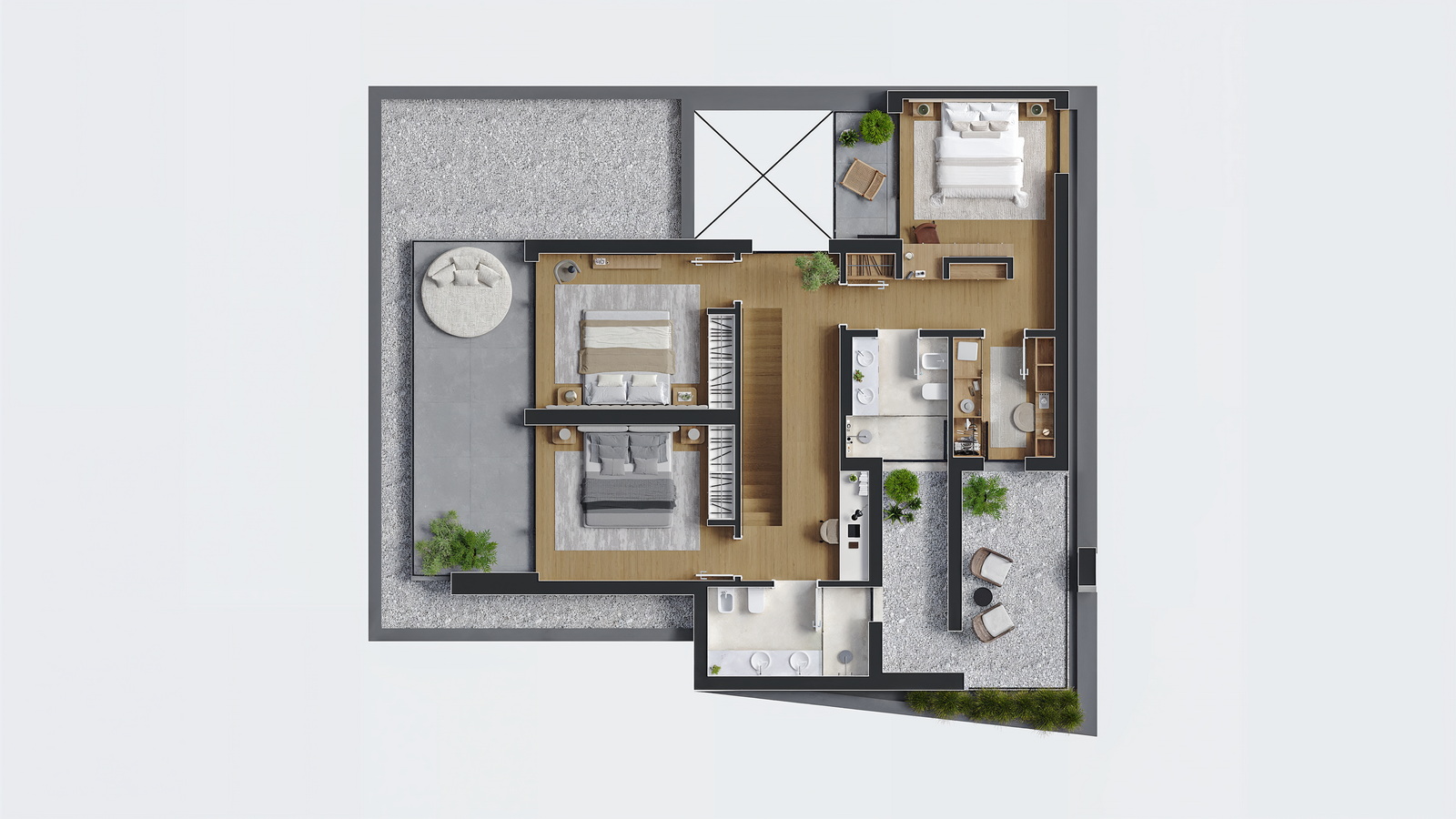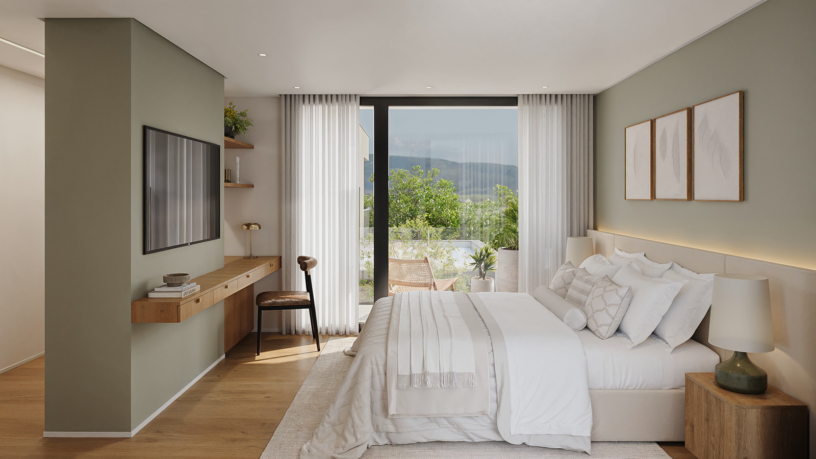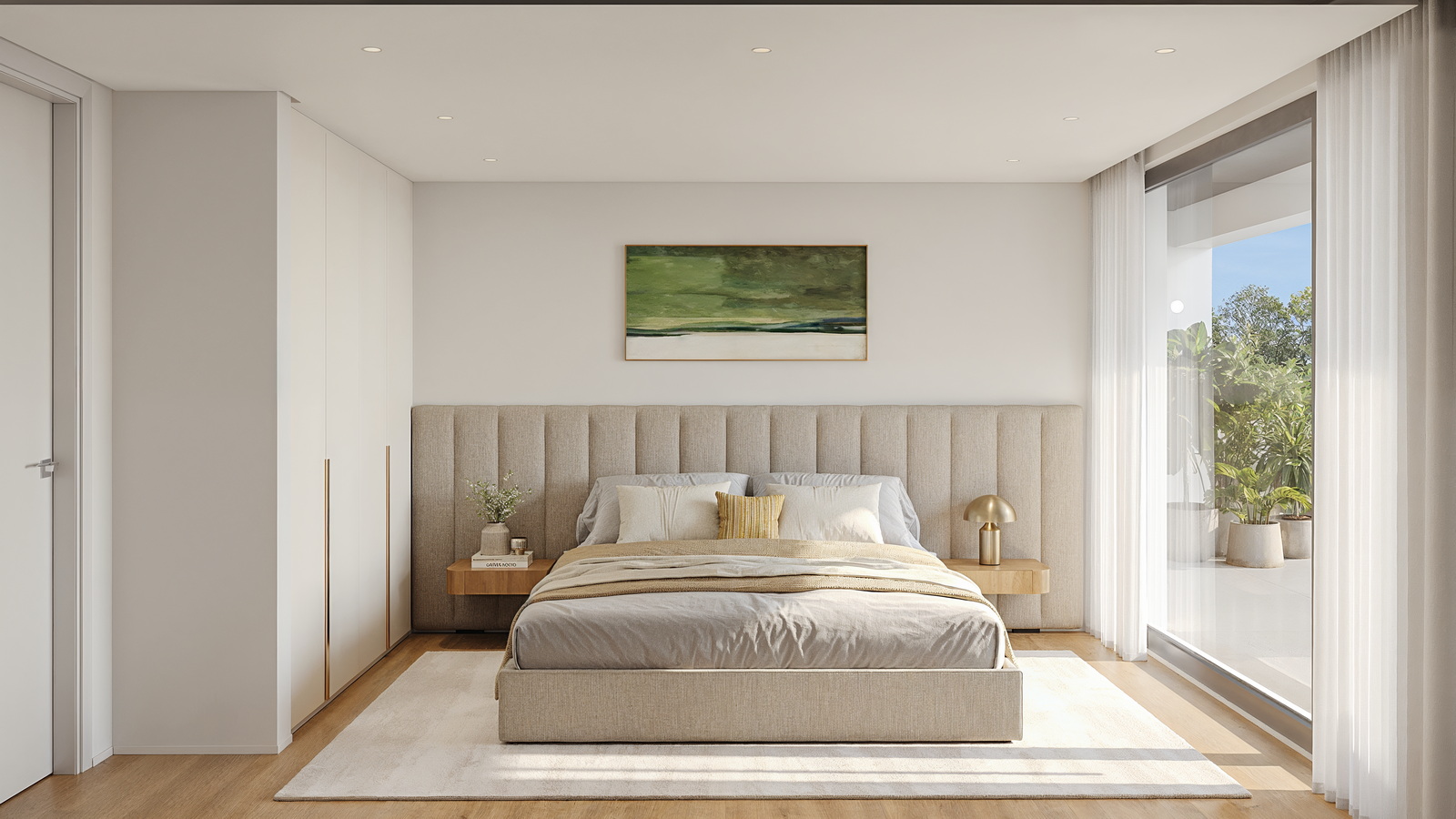 - Pavimentos flutuantes em madeira natural e cerâmica em zonas molhadas